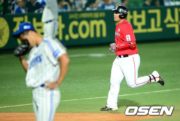 11일 오후 대구 시민운동장에서 열린 '2013 한국야쿠르트 세븐프로야구' 삼성 라이온즈와 SK 와이번스의 경기, 7회초 1사 1,2루 SK 이재원이 삼성 권혁을 상대로 우측 담장을 넘기는 3점 홈런을 때린 뒤 베이스를 돌고 있다.