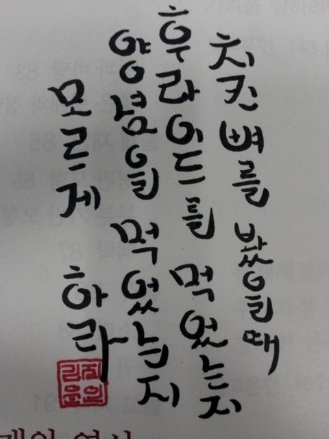 공개된 사진에는 붓글씨로 ‘치킨 뼈를 봤을 때 후라이드를 먹었는지 양념을 먹었는지 모르게 하라’고 적혀있다. 뼈에 붙은 살점이 없도록 깨끗하게 먹으라는 뜻이라 보는 이들의 웃음을 자아내게 한다.