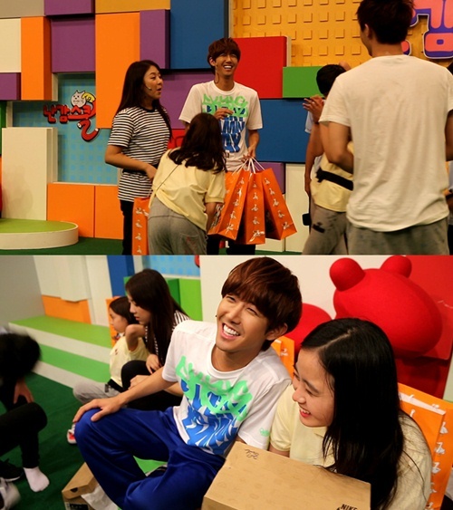 보이그룹 제국의아이들 멤버 광희와 걸그룹 쥬얼리 멤버 예원이 '난감스쿨' 어린이들에게 운동화를 선물했다.