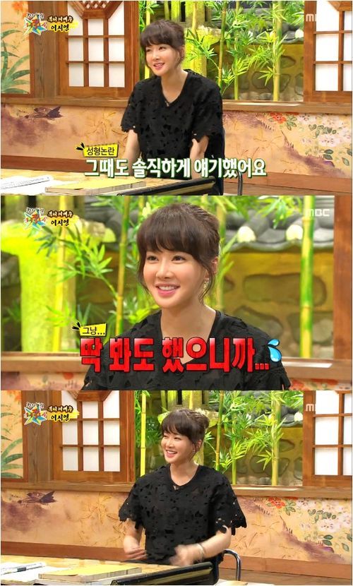 이시영은 11일 방송된 MBC 토크쇼 ‘황금어장-무릎팍도사’에서 성형 논란에 대한 질문을 받고 “처음 과거 사진이 공개됐을 때도 솔직하게 이야기 했다”고 담담하게 말했다.