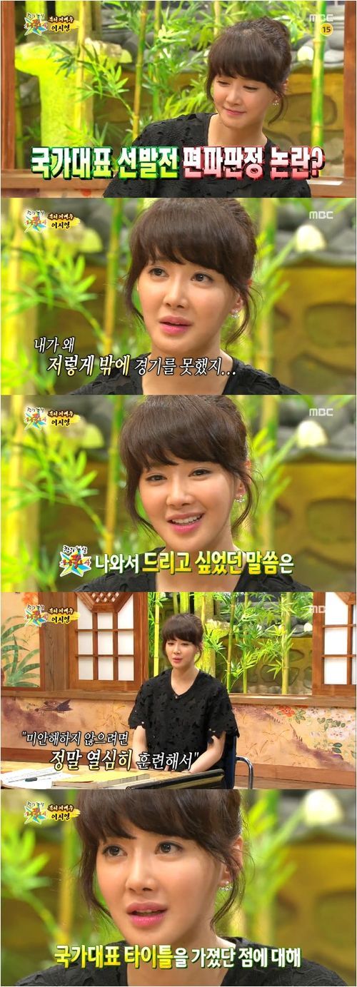 이시영은 11일 방송된 MBC 토크쇼 ‘황금어장-무릎팍도사’에서 최근 김다솜 선수와의 국가대표 선발전에서 승리한 후 불거진 편파판정 논란에 대해 입을 열었다.