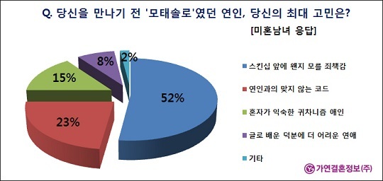 결혼정보회사 가연과 가연결혼정보가 운영하는 프리미엄 매칭 사이트 안티싱글에서 미혼남녀 310명(미혼남성 154명, 미혼여성 156명)을 대상으로 '당신을 만나기 전 ‘모태솔로’였던 연인, 당신의 최대 고민은?'이라는 주제로 설문조사를 실시했다.