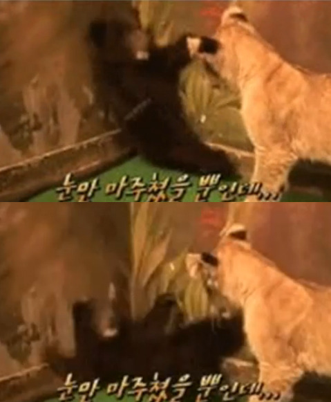 '놀란 아기 곰' 영상에는 아기 곰과 아기 사자의 대면하는 모습이 담겨 있다. 아기 곰은 아기 사자를 본 직후 벽에 기대에 놀란 듯한 모습을 보이다가, 아기 사자가 더 접근하자 누워지는 등 겁을 먹은 모습이 역력해 보인다.