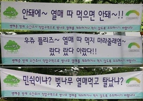 ‘센스만점 공무원’의 현수막에는 “안돼에~ 열매 따먹으면 안돼에~”, “우쥬 플리즈~ 열매 따 먹지 마라줄래염~”, “민쉭이냐? 벚나무 열매먹고 탈났냐?” 등의 문구가 나온다.