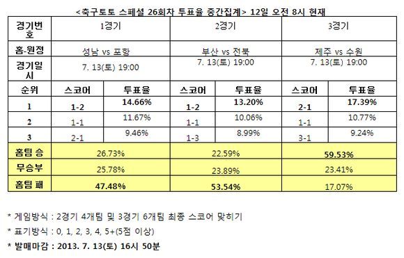 K리그 클래식 3경기 대상 축구토토 스페셜 26회차 투표율 중간집계 결과