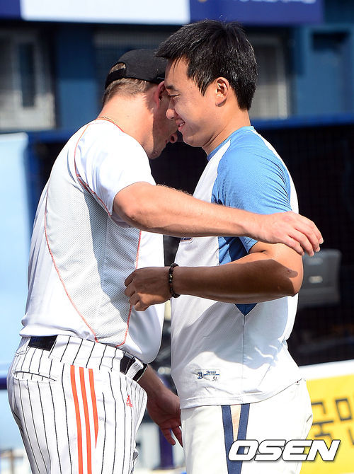 12일 오후 창원 마산구장에서 열리는 '2013 한국야쿠르트 세븐 프로야구' NC 다이노스와 롯데 자이언츠의 경기전 롯데 옥스프링과 NC 김태군이 포옹을 하고 있다.