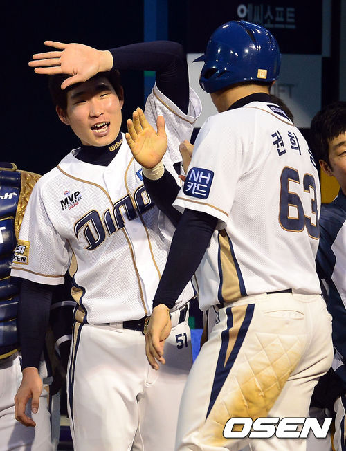 12일 오후 창원 마산구장에서 열린 '2013 한국야쿠르트 세븐 프로야구' NC 다이노스와 롯데 자이언츠의 경기, 4회말 1사 1,3루 NC 이현곤의 적시타로 득점을 올린 권희동이 이재학과 기뻐하고 있다.