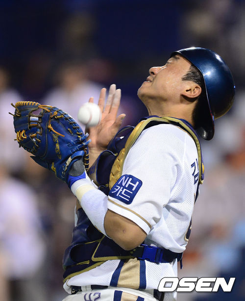 12일 오후 창원 마산구장에서 열린 '2013 한국야쿠르트 세븐 프로야구' NC 다이노스와 롯데 자이언츠의 경기, 8회초 무사 2루 NC 김태군이 롯데 이승화의 번트 플라이 타구를 잡아내고 있다.