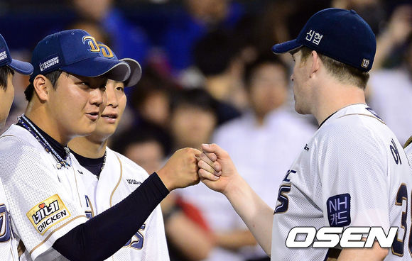 경기 종료 후 승리를 거둔 NC 이민호와 에릭이 기뻐하고 있다. / youngrae@osen.co.kr