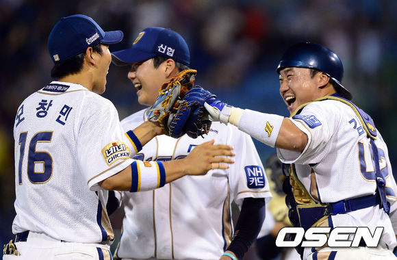 경기 종료 후 승리를 거둔 NC 이민호, 모창민, 김태군이 기뻐하고 있다. / youngrae@osen.co.kr
