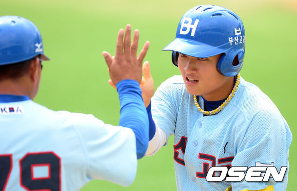 13일 오전 부산 구덕야구장에서 열린 2013 고교야구 광역리그 부산고와 포철고의 경기, 3회초 2사 1,2루 부산고 안중열이 1타점 적시타를 때리고 1루 코치와 하이파이브를 하고 있다.