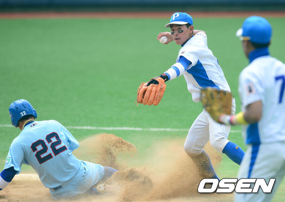 13일 오전 부산 구덕야구장에서 열린 2013 고교야구 광역리그 부산고와 포철고의 경기, 5회초 무사 1루 부산고 명건우의 2루 앞 땅볼 타구때 포철고 송비호가 부산고 1루 주자 안중열를 포스아웃으로 잡아낸 뒤 1루로 송구하고 있다.