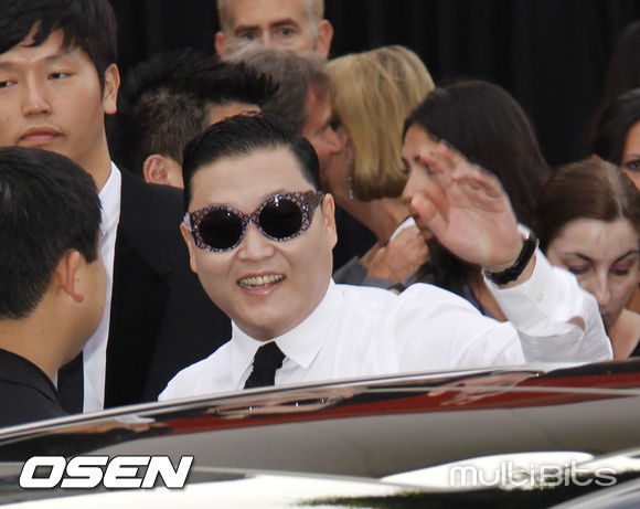 [OSEN=이슈팀] 월드스타 싸이가 11일(현지시간) 미국 캘리포니아 LA에서 열린 영화 레드 2(레드: 더 레전드) 시사회에 착석, 팬들에게 인사를 하고 있다.