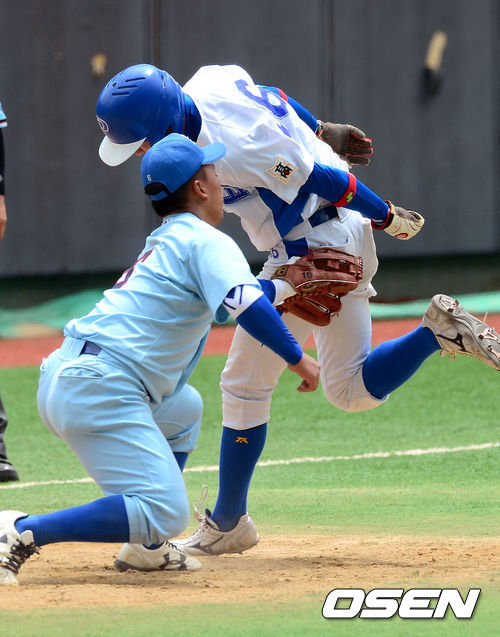 13일 오전 부산 구덕야구장에서 열린 2013 고교야구 광역리그 부산고와 포철고의 경기, 6회말 무사 2루 포철고 이재훈이 3루 도루를 시도하다 런다운에 걸려 부산고 명건우에게 태그아웃 당하고 있다.