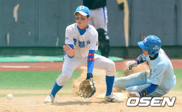 13일 오전 부산 구덕야구장에서 열린 2013 고교야구 광역리그 부산고와 포철고의 경기, 8회초 무사 2루 부산고 윤보성 타석때 2루 주자 노해송이 포철고 백찬우의 실책을 틈타 3루 까지 진루하고 있다.