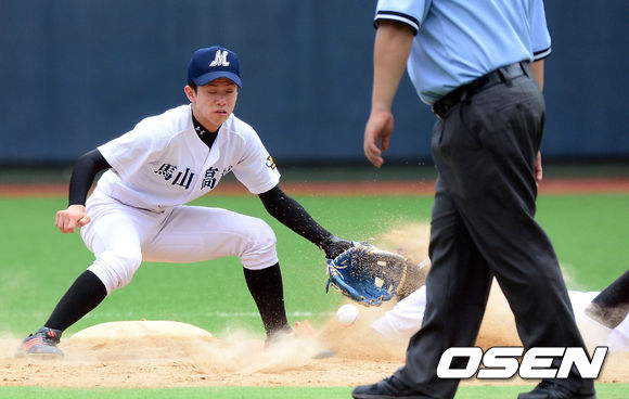 13일 오후 부산 구덕야구장에서 열린 2013 고교야구 광역리그 부산공고와 마산고의 경기, 1회초 2사 1루 마산고 박성준이 2루 도루하는 부산고 1루 주자를 잡기위해 던진 공을 놓치고 있다.