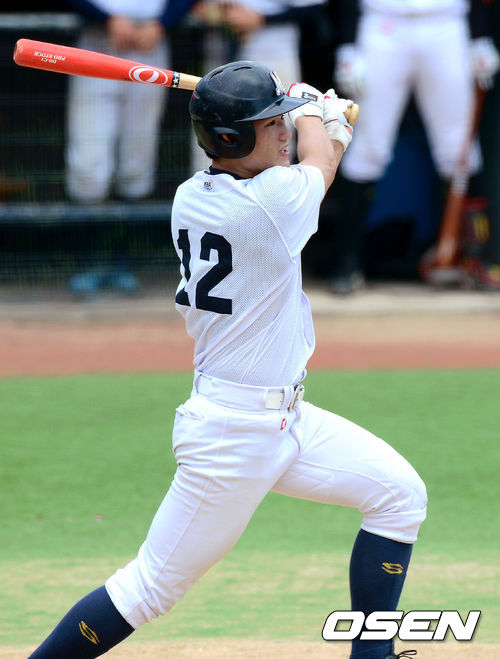 13일 오후 부산 구덕야구장에서 열린 2013 고교야구 광역리그 부산공고와 마산고의 경기, 4회말 무사 2,3루 마산고 강진호가 2타점 적시타를 때리고 있다.