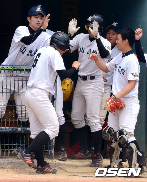 13일 오후 부산 구덕야구장에서 열린 2013 고교야구 광역리그 부산공고와 마산고의 경기, 4회말 무사 2,3루 마산고 선수들이 득점을 올린 뒤 기뻐하고 있다.