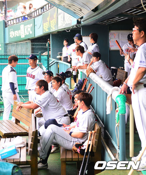 13일 오후 서울 잠실구장에서 2013 한국야쿠르트 세븐프로야구 두산 베어스와 KIA 타이거즈의 경기가 열릴 예정인 두산 선수들이 덕아웃에서 내리는 비를 지켜보고 있다.