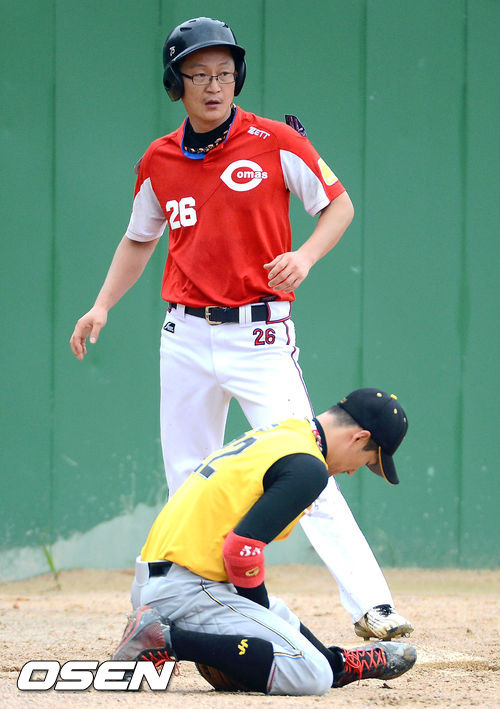 5회말 덴탈코마스 김인호가 이재형의 타석에서 2루 도루에 성공한뒤 상대 수비수 송구 실책을 틈타 3루까지 파고들어 안착하고 있다.