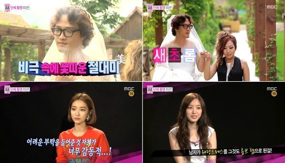 조정치는 13일 방송된 MBC '우리 결혼했어요4'에서 흰색 웨딩드레스를 입고 출연자들 앞에 섰다. 이 모습을 본 정진운, 태민은 패닉에 빠진듯 깜짝 놀란 듯한 표정을 지어보였다.
