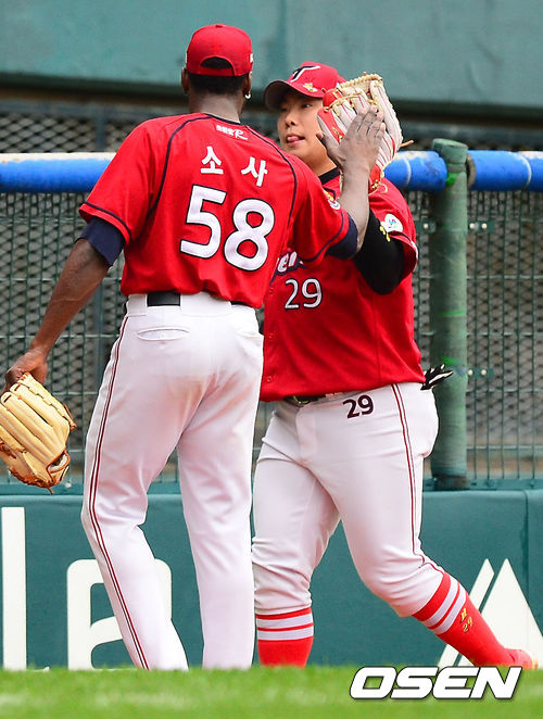13일 오후 서울 잠실구장에서 열린 2013 한국야쿠르트 세븐프로야구 두산 베어스와 KIA 타이거즈의 경기, 1회말 2사 주자 1루 두산 최준석의 타구를 KIA 나지완이 달려나와 잡아낸 후 KIA 선발 소사와 하이파이브를 하고 있다.