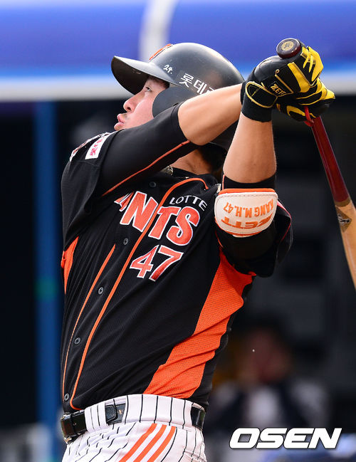 13일 오후 창원 마산구장에서 열린 '2013 한국야쿠르트 세븐 프로야구' NC 다이노스와 롯데 자이언츠의 경기, 1회초 1사 1,3루 롯데 강민호가 우익수 희생플라이를 때리고 있다.