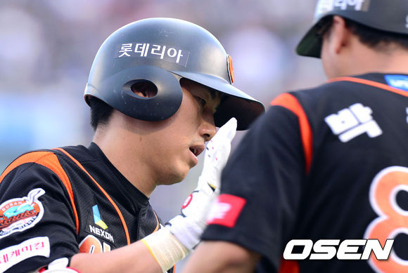 13일 오후 창원 마산구장에서 열린 '2013 한국야쿠르트 세븐 프로야구' NC 다이노스와 롯데 자이언츠의 경기, 1회초 2사 2루 롯데 장성호가 2점 홈런을 때린 뒤 3루 코치와 하이파이브를 하고 있다.