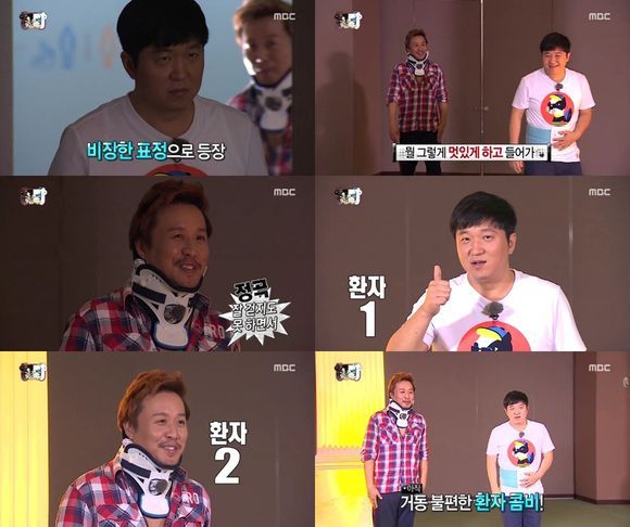 이후 장면은 한 실내로 전환, 탈장 수술로 거동이 불편한 정형돈과 목 깁스를 한 정준하가 모습을 드러내 시청자들의 시선을 모았다.