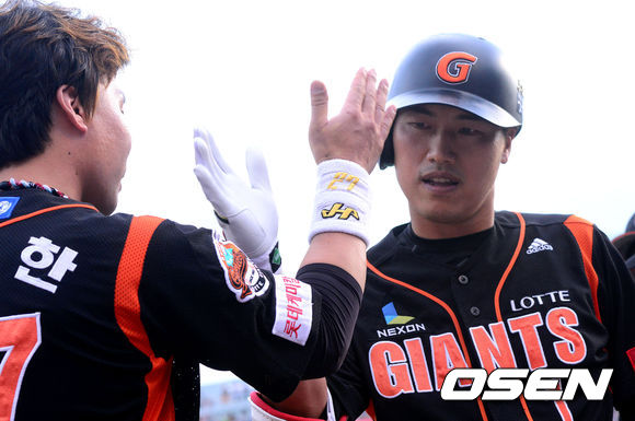 13일 오후 창원 마산구장에서 열린 '2013 한국야쿠르트 세븐 프로야구' NC 다이노스와 롯데 자이언츠의 경기, 1회초 2사 2루 롯데 장성호가 2점 홈런을 때린 뒤 용덕한과 세레모니를 하고 있다.