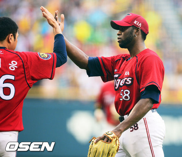 13일 오후 서울 잠실구장에서 열린 2013 한국야쿠르트 세븐프로야구 두산 베어스와 KIA 타이거즈의 경기, KIA 선발 소사가 2회를 마치고 덕아웃으로 들어오며 서재응과 하이파이브를 하고 있다.