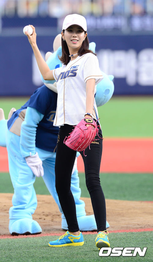 13일 오후 창원 마산구장에서 열린 '2013 한국야쿠르트 세븐 프로야구' NC 다이노스와 롯데 자이언츠의 경기에 앞서 2013 미스코리아 미(미스 경남 진) 구본화 씨가 시구를 하고 있다.