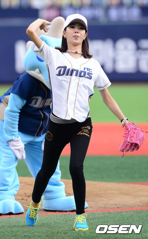 13일 오후 창원 마산구장에서 열린 '2013 한국야쿠르트 세븐 프로야구' NC 다이노스와 롯데 자이언츠의 경기에 앞서 2013 미스코리아 미(미스 경남 진) 구본화 씨가 시구를 하고 있다.