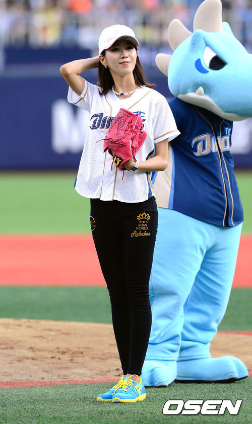 13일 오후 창원 마산구장에서 열린 '2013 한국야쿠르트 세븐 프로야구' NC 다이노스와 롯데 자이언츠의 경기에 앞서 2013 미스코리아 미(미스 경남 진) 구본화 씨가 시구를 하고 있다.