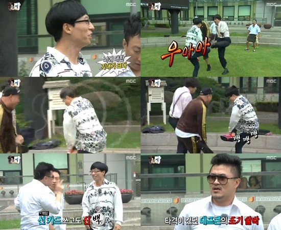 방송인 유재석이 방송인 노홍철의 사자후 기세에 밀려 닭싸움에서 패배했다.