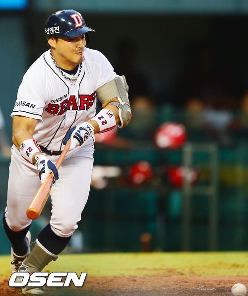 13일 오후 서울 잠실구장에서 열린 2013 한국야쿠르트 세븐프로야구 두산 베어스와 KIA 타이거즈의 경기, 4회말 무사 주자 1루 두산 홍성흔이 투수 앞 번트 안타에 성공하고 있다.