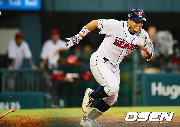 13일 오후 서울 잠실구장에서 열린 2013 한국야쿠르트 세븐프로야구 두산 베어스와 KIA 타이거즈의 경기, 4회말 무사 주자 1루 두산 홍성흔이 투수 앞 번트 안타에 성공하고 있다.