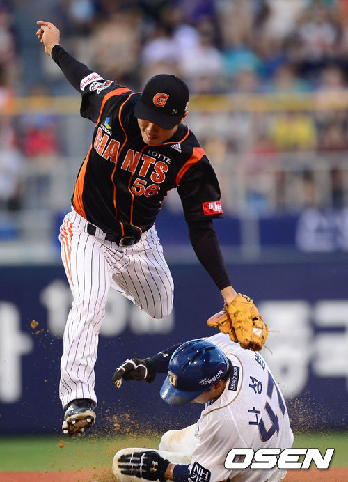 13일 오후 창원 마산구장에서 열린 '2013 한국야쿠르트 세븐 프로야구' NC 다이노스와 롯데 자이언츠의 경기, 3회말 2사 1루 NC 나성범이 2루 도루를 성공하고 있다.