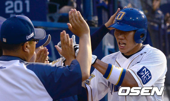 13일 오후 창원 마산구장에서 열린 '2013 한국야쿠르트 세븐 프로야구' NC 다이노스와 롯데 자이언츠의 경기, 4회말 무사 2루 NC 박정준의 투수 앞 땅볼때 2루 주자 모창민이 롯데 정훈의 실책으로 홈에 들어와 득점을 올린 뒤 기뻐하고 있다.