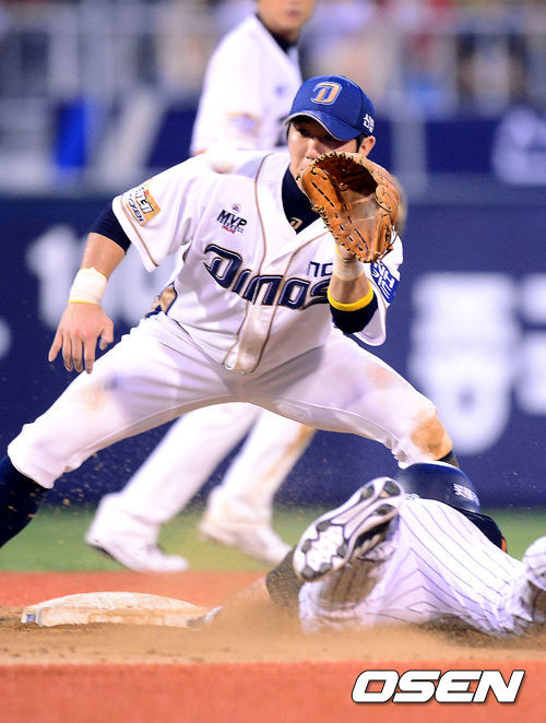 13일 오후 창원 마산구장에서 열린 '2013 한국야쿠르트 세븐 프로야구' NC 다이노스와 롯데 자이언츠의 경기, 5회초 1사 1루 롯데 손아섭이 2루 도루를 성공하고 있다.
