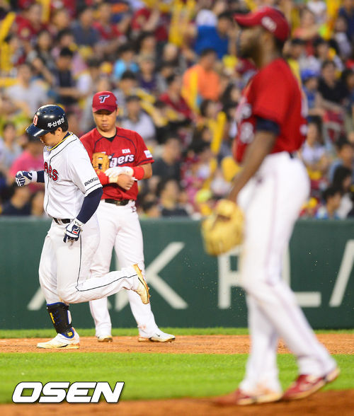 13일 오후 서울 잠실구장에서 열린 2013 한국야쿠르트 세븐프로야구 두산 베어스와 KIA 타이거즈의 경기, 5회말 무사 주자 1,3루 두산 김현수가 우월 스리런 홈런을 날린 후 그라운드를 돌고 있다.