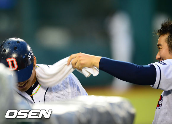 13일 오후 서울 잠실구장에서 열린 2013 한국야쿠르트 세븐프로야구 두산 베어스와 KIA 타이거즈의 경기, 5회말 무사 주자 1,3루 두산 김현수가 우월 스리런 홈런을 날린 후 덕아웃에서 선발 유희관에게 수건으로 축하를 받고 있다.
