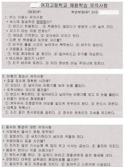 선생님이 나줘준 유인물을 찍은 것으로 문답식으로 체험학습 유의사항이 담겨있다. 내용을 살펴보면 학생들이 정확한 시간에 집결하지 않으면 “날아가는 비행기를 보며 눈물을 흘린다” 도착할 때 소지품을 챙기지 않으면 " 날아가는 비행기를 보며 또 눈물을 흘린다" 비행기 안에서 휴대폰을 켜두면 "조정 장치에 이상을 일으켜 우주인이 된다” 등 황당한 얘기들이 나와 있다.