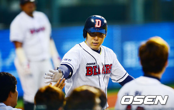 13일 오후 서울 잠실구장에서 열린 2013 한국야쿠르트 세븐프로야구 두산 베어스와 KIA 타이거즈의 경기, 5회말 무사 주자 1,3루 두산 김현수가 우월 스리런 홈런을 날린 후 덕아웃에서 동료들과 하이파이브를 하고 있다.