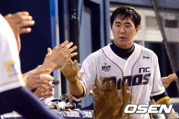 13일 오후 창원 마산구장에서 열린 '2013 한국야쿠르트 세븐 프로야구' NC 다이노스와 롯데 자이언츠의 경기, 5회말 1사 1루 NC 차화준이 나성범의 안타와 롯데 강민호의 실책으로 득점을 올린 뒤 동료들과 기뻐하고 있다.