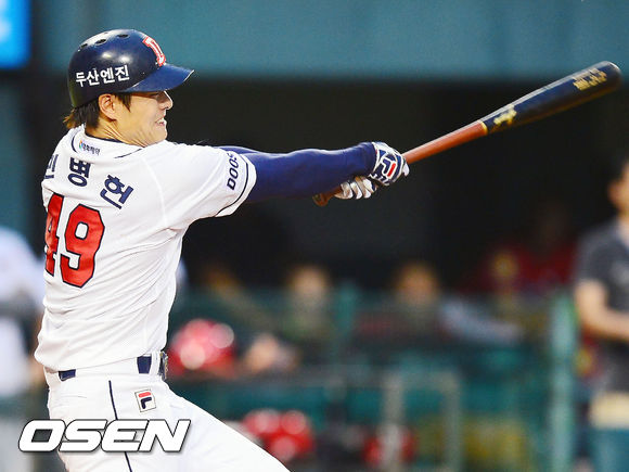 13일 오후 서울 잠실구장에서 열린 2013 한국야쿠르트 세븐프로야구 두산 베어스와 KIA 타이거즈의 경기, 3회말 2사 주자 1루 두산 민병헌이 좌중간 선취 1타점 적시타를 날리고 있다.