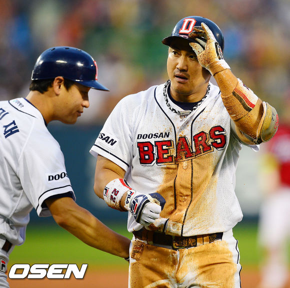 13일 오후 서울 잠실구장에서 열린 2013 한국야쿠르트 세븐프로야구 두산 베어스와 KIA 타이거즈의 경기, 4회말 무사 주자 1루 두산 홍성흔이 투수 앞 번트 안타에 성공한 후 기뻐하고 있다.