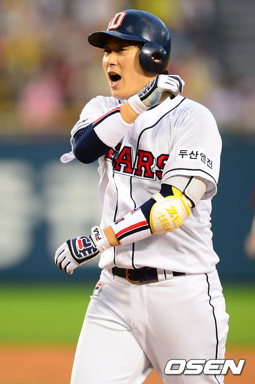 13일 오후 서울 잠실구장에서 열린 2013 한국야쿠르트 세븐프로야구 두산 베어스와 KIA 타이거즈의 경기, 4회말 1사 주자 2,3루 두산 이원석이 1타점 적시타를 날린 후 1루에서 기뻐하고 있다.