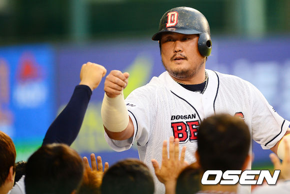 13일 오후 서울 잠실구장에서 열린 2013 한국야쿠르트 세븐프로야구 두산 베어스와 KIA 타이거즈의 경기, 4회말 1사 주자 2,3루 두산 이원석의 1타점 적시타때 홈을 밟은 최준석이 덕아웃에서 동료들과 하이파이브를 하고 있다.