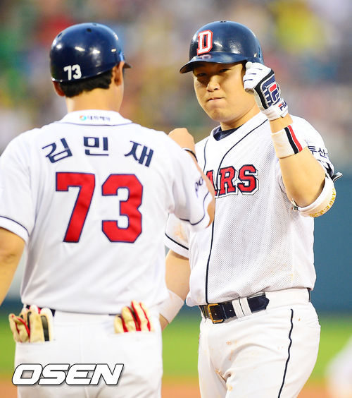 13일 오후 서울 잠실구장에서 열린 2013 한국야쿠르트 세븐프로야구 두산 베어스와 KIA 타이거즈의 경기, 4회말 1사 주자 1,3루 두산 양의지가 좌익수 오른쪽 1타점 적시타를 날린 후 1루에서 김민재 코치와 하이파이브를 하고 있다.